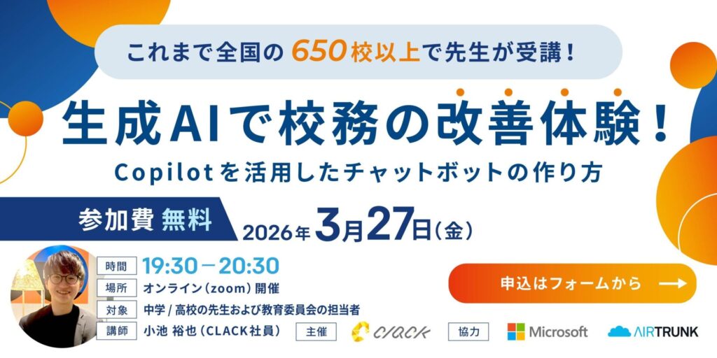 3/27(金)19:30–20:30に、先生方の校務に直結するテーマでオンライン研修を行います。 今回は 「生成AIで校務の改善体験!」 をテーマに、Copilotを活用したチャットボット作りを1時間で実演します。 ■開 […]